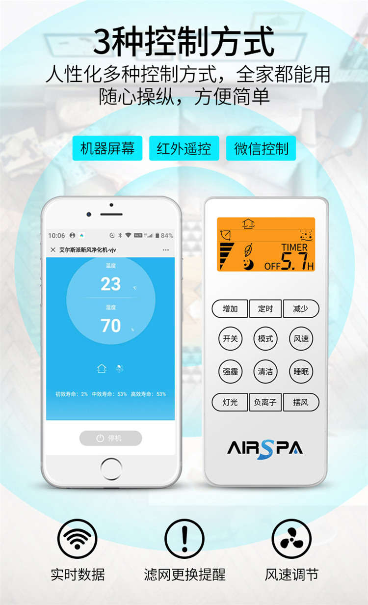 5、智能風閥控制,智能化霜,濾網更換提醒,擺風功能、空氣指示燈
